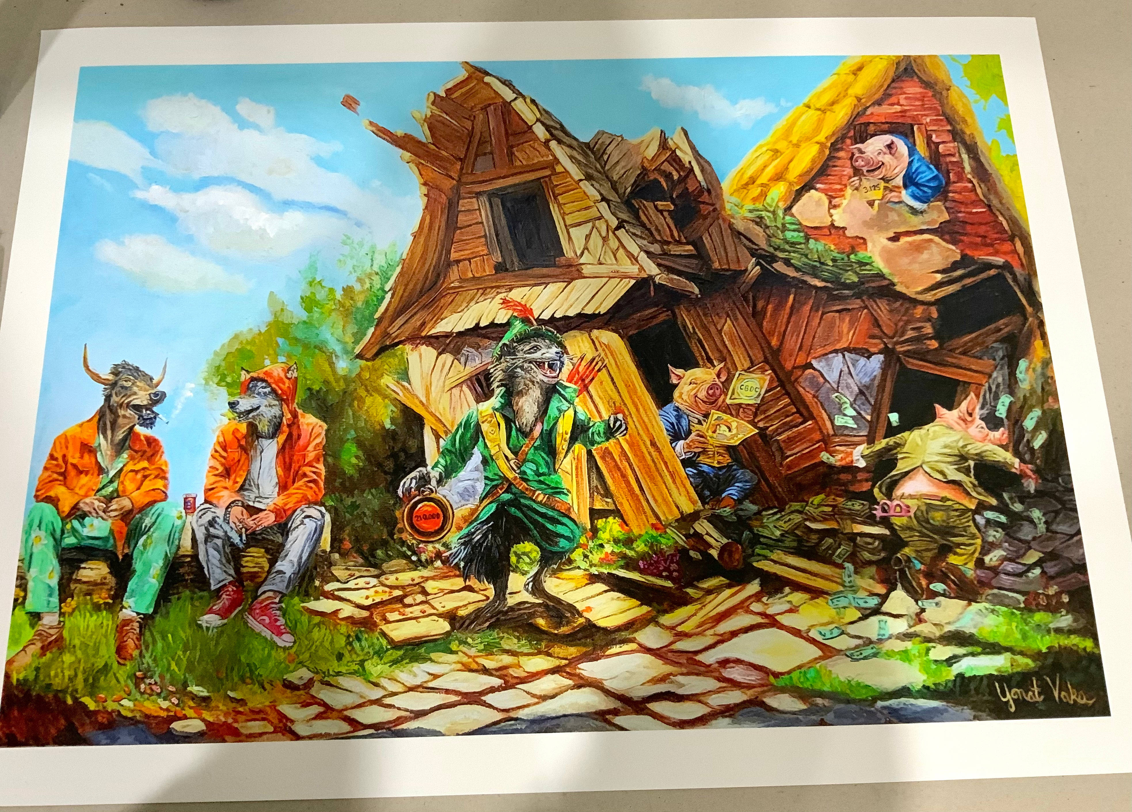 Each painting in this series is based on a known joke line, with recurring characters that always have the last laugh. Easter eggs are embedded in each one. Can you spot them?