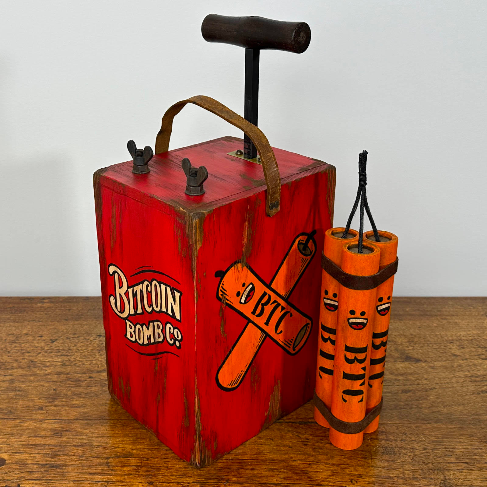 The Bitcoin Blasting Machine & BTC Dynamite were recently found in an old abandoned bitcoin mine. These relics are from the early mining days, and date back over a hundred years. They are made from wood, metal, leather, and acrylic paint. The plunger height is adjustable as it can be pushed down and pulled up. These treasures are sure to bring the biggest boom to any Bitcoin party.