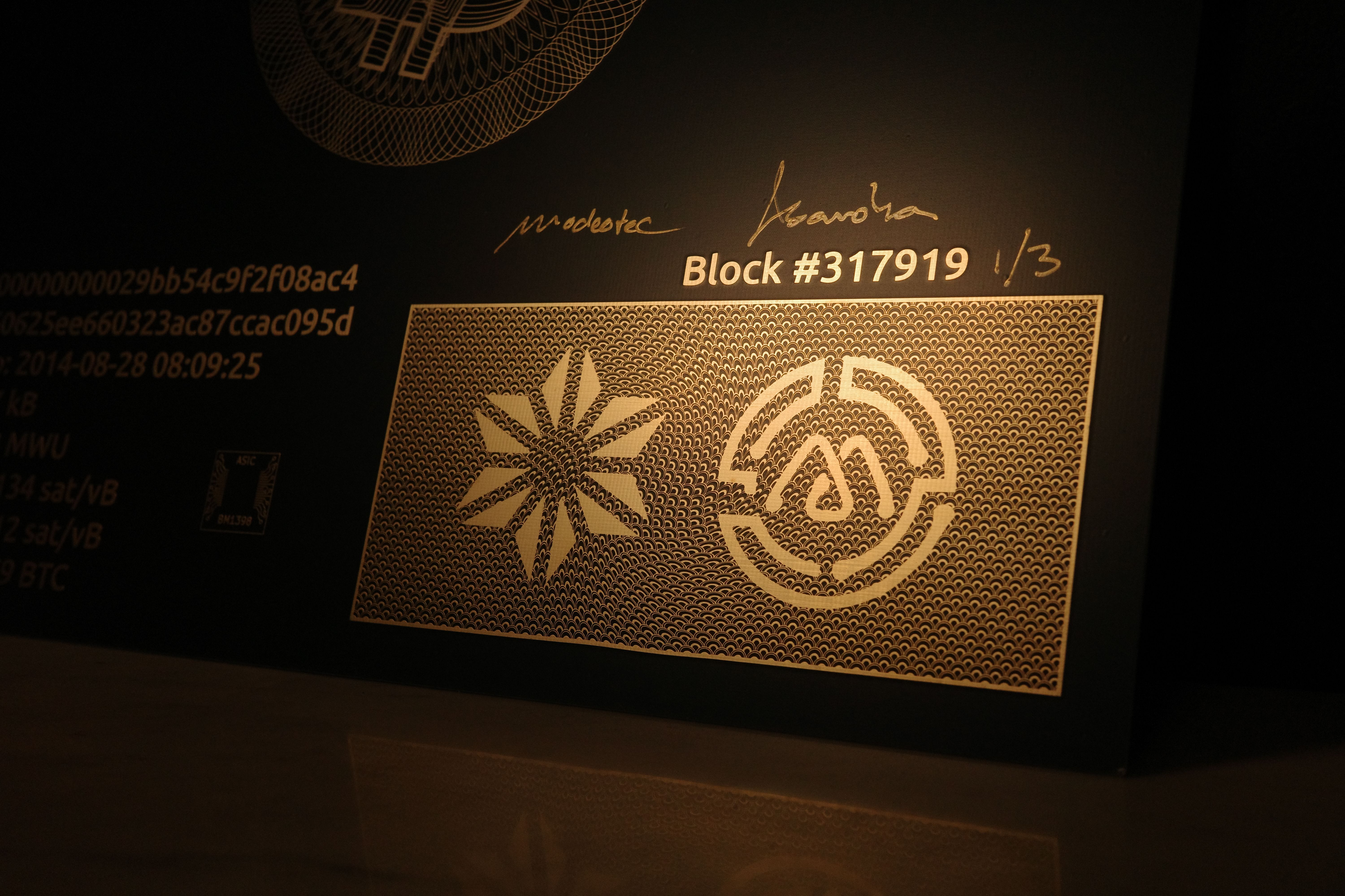A collaboration between Asanoha & Modeotec, featuring the mempool.space visualization of Block #317919. This block was mined at 8:09am on August 28th, 2014. This artwork commemorates the day Hal Finney died.
