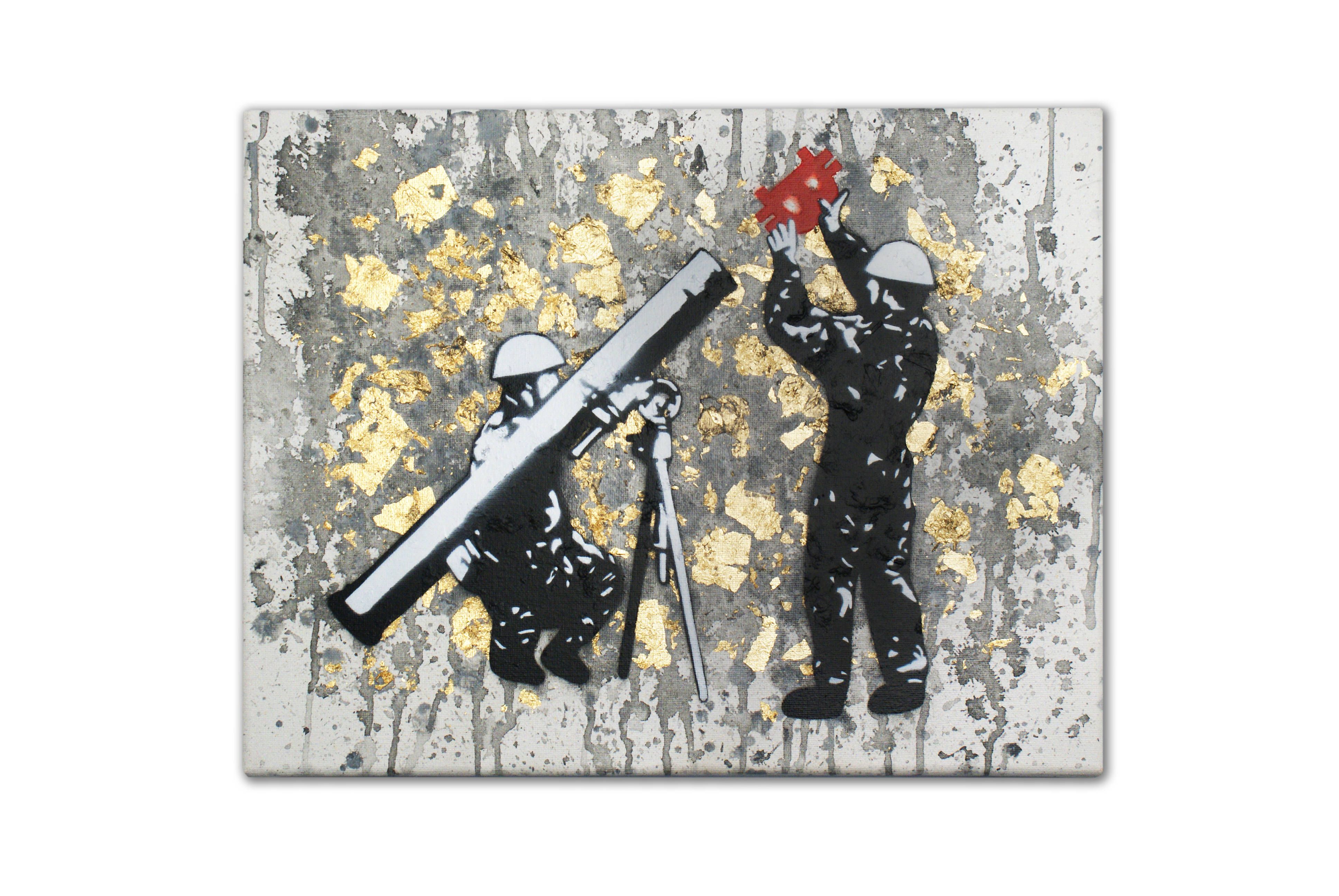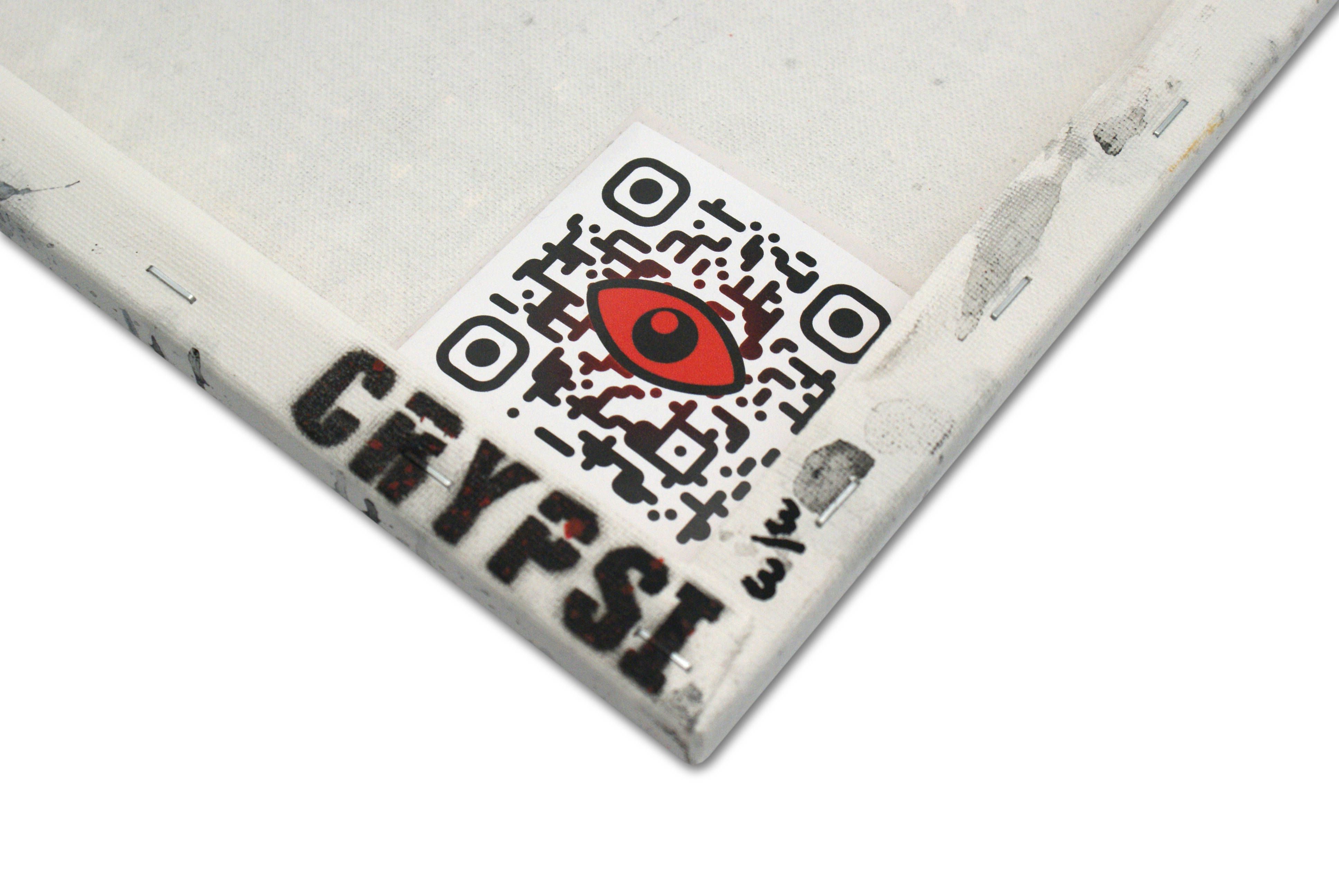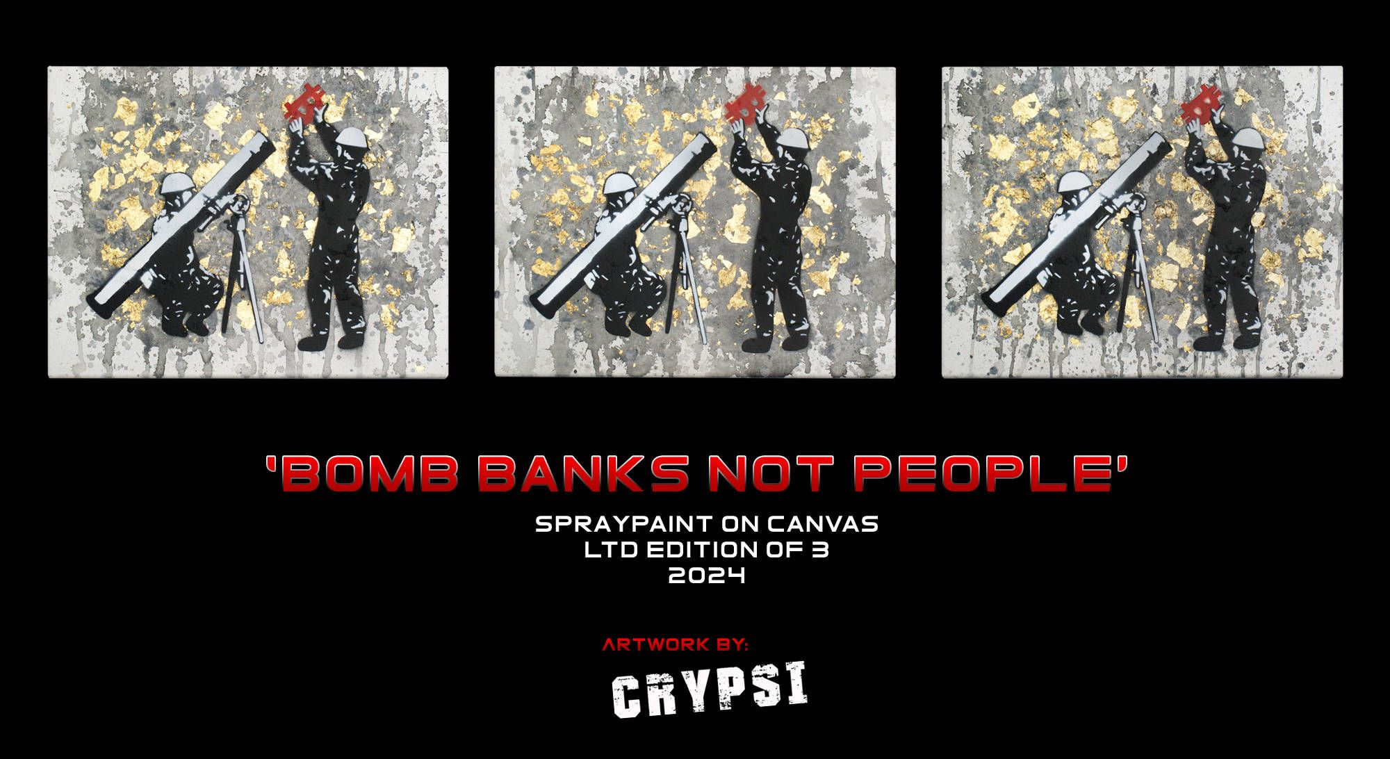 Bomb Banks Not People is an original spray painted picture on canvas by Crypsi, number 3 of a limited edition of 3 from 2024.