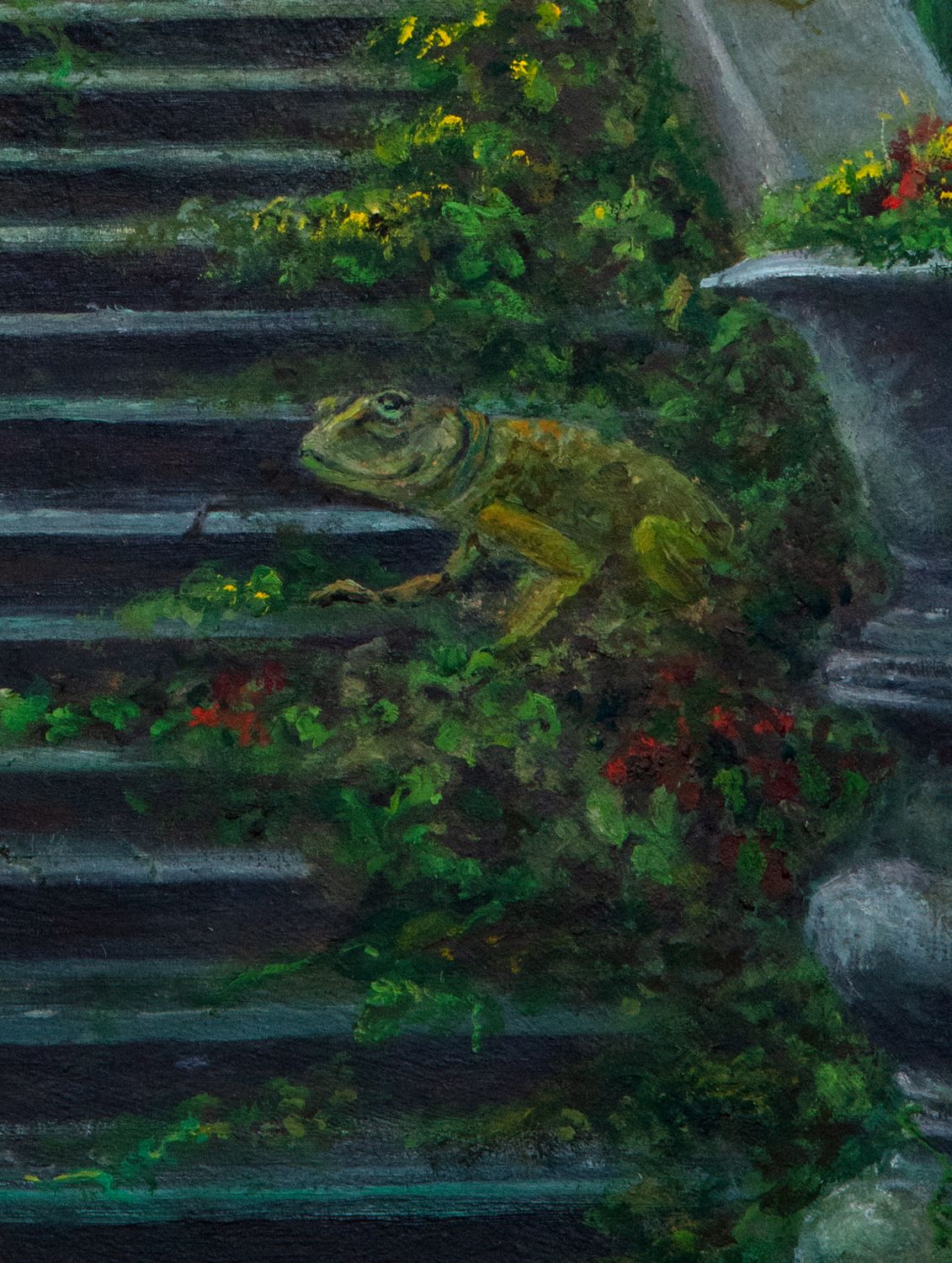In a blend of art and the digital age, the painting unveils a futuristic woman embodying the essence of innovation, akin to the adaptability of a blockchain. The two frogs on historical steps represent Pepe as well as the transition from traditional finance to the digital era, mirroring the nearby futuristic city and radiant sun circle, collectively conveying the transformative power of cryptocurrency in shaping our future.
