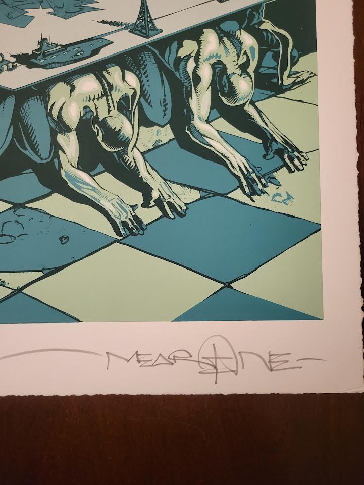"Mayer Amschel Rothschild once said, 'Give me control of a nation’s money and I care not who makes the laws.' Using this as my ideological starting point, I chose to depict the likeness of such early turn of the century robber barons amidst a dark vision of an apocalyptic reality fueled by their greed, filling our skies with coal, nuclear and chemtrail pollution. These men and their dynasties, whom I believe do not subscribe to any reasonable human code of morality, have put parameters around what our reality consists of and are destroying our planet, indebting us in the trillions, profiting in the billions, while displacing millions financing wars through illegal taxation. These wicked banksters have indeed been playing a game of monopoly on the backs of the working class. Art has always been my tool of communication to describe reality as I’m living it, delving into history, politics, science and philosophy. Given the times we are living in today – rich getting richer, poor getting poorer – I felt the need to speak out about these crimes against humanity. But the fact remains that some are highly uncomfortable with these truths and use divisive acts, systematic bullshit lies and propaganda to keep us separated and enslaved as they continue to rob and pillage the earth. So how do we get out from under the tyrannical grip of the banking globalists and corporations ruling our world? I believe it exists in the decentralization of our monetary system in order to achieve true freedom for humanity. Bitcoin is freedom. Bitcoin is peace. There is only one. All we gotta do is stand up and it’s game over! PEACE, MEAR ONE”
