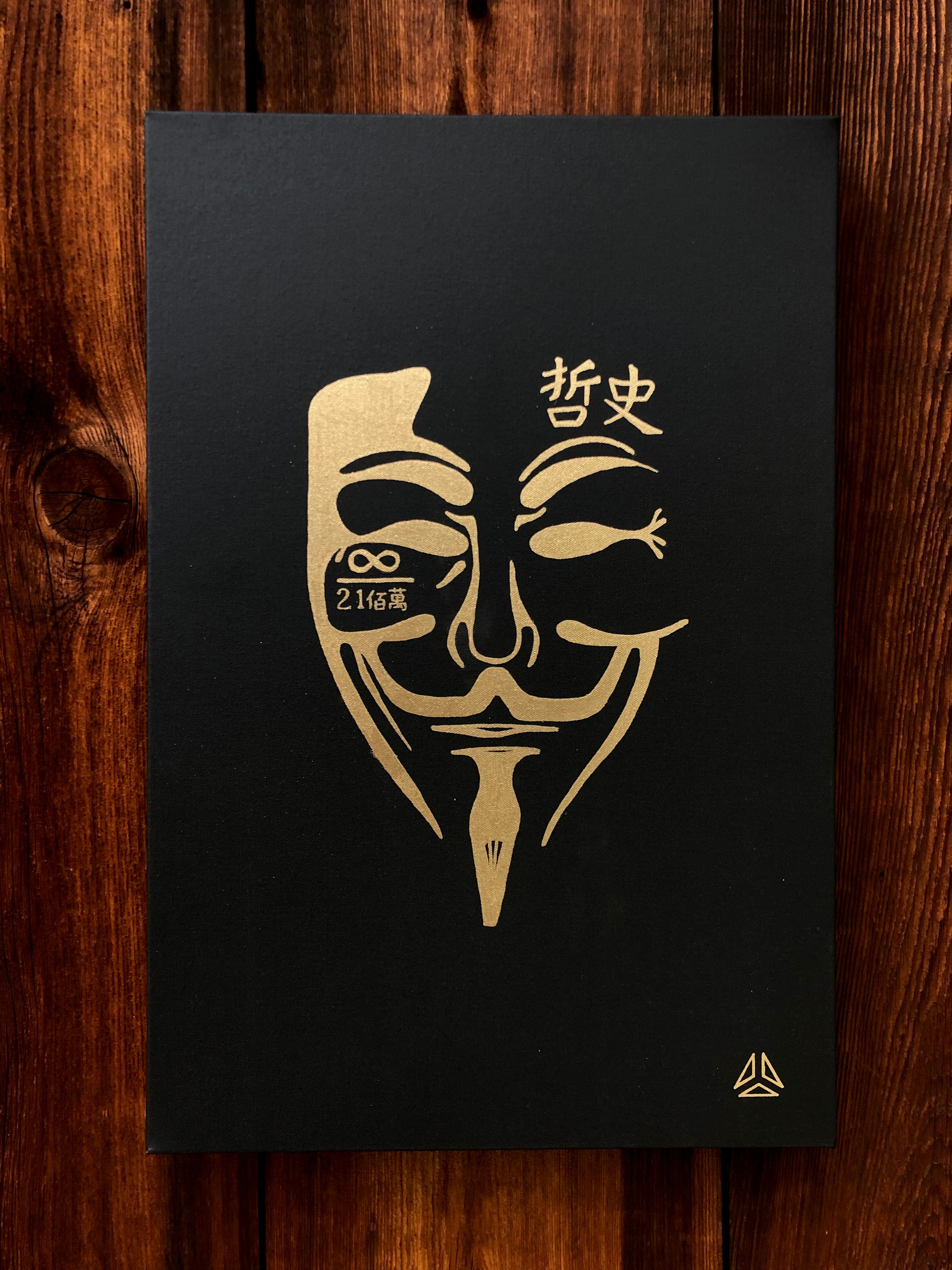 The Kanji in the upper right of the piece means, “Satoshi”. The first character represents, “Wise, Sage, Philosopher”. For he is the sage philosopher, leading us to a world of truth and freedom. Non-discriminating, permissionless, anonymous, borderless, of no color nor creed. Such characteristics as also represented by our dear friend Guy Fawkes.