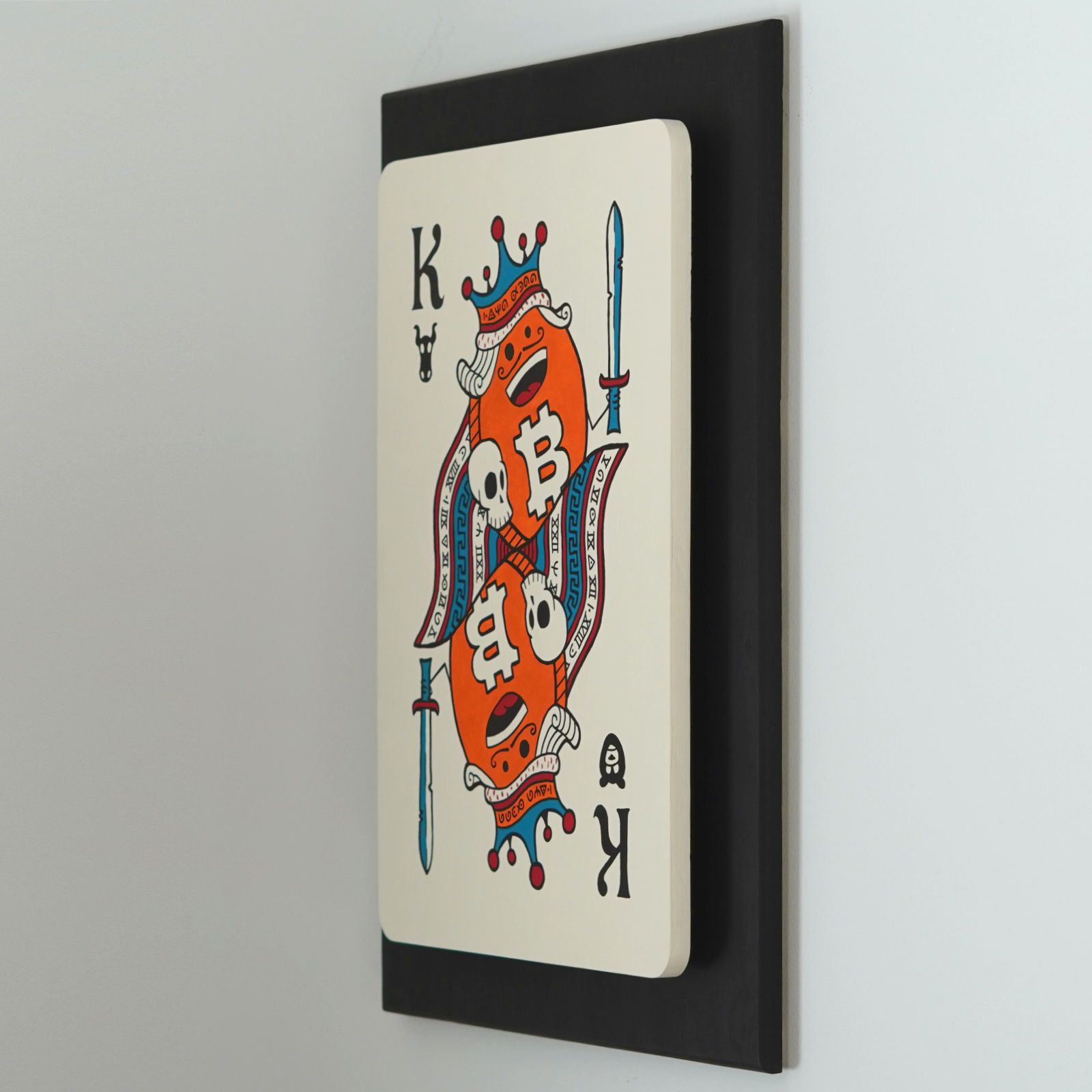 The King of Money beats fiat and all other monies of the world. Whether it is a bear or bull market this is the card you want. This painting can be mounted bull side up or bear side up. The main art piece is mounted 0.5 inches from the matte black back so it appears to be floating. Painted by the original creator of the Bitcoin Roller Coaster Guy.
