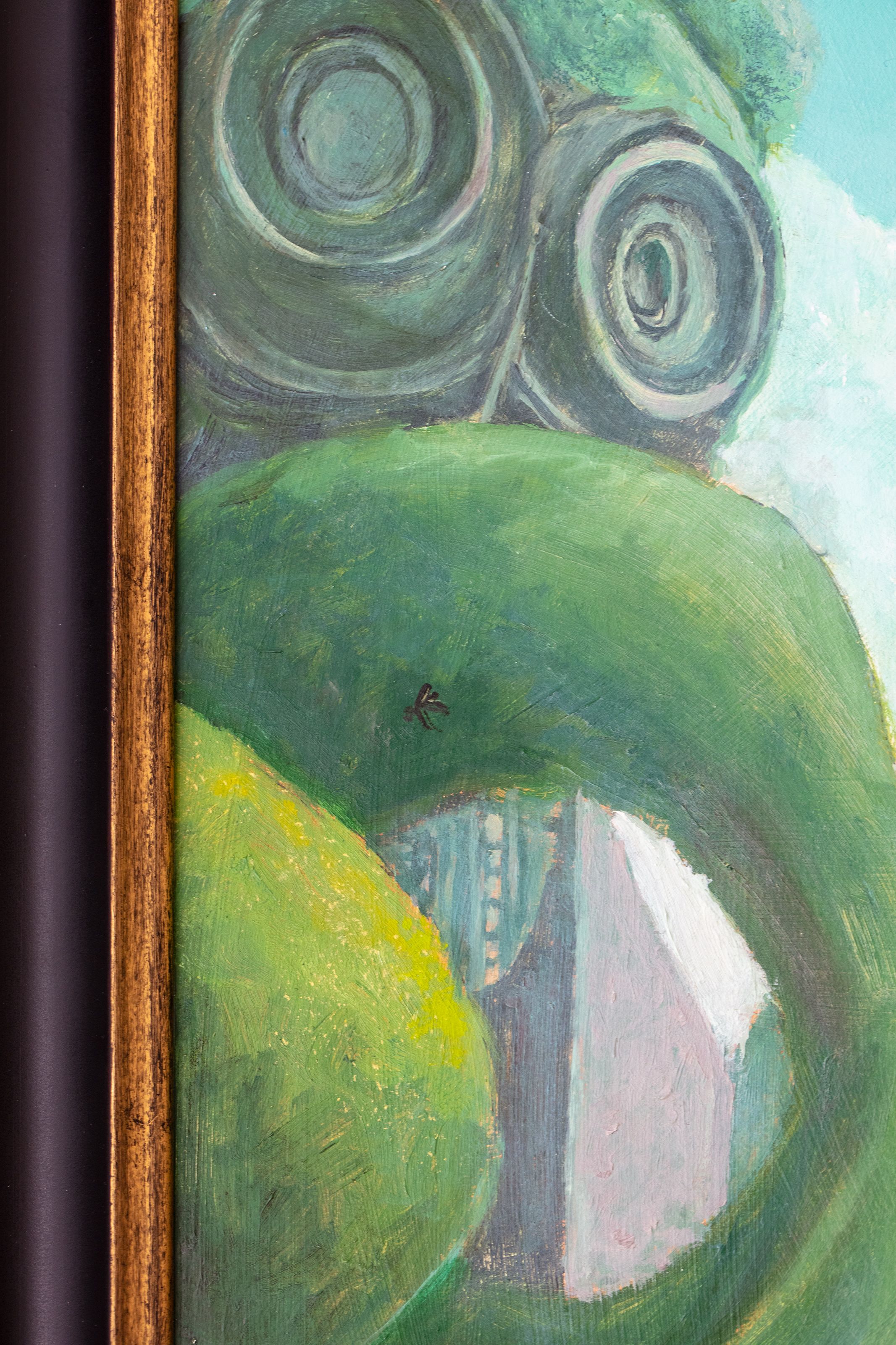 "UNTAMED" is a new oil painting by Nikolina Petolas that explores the concept of the Green as a realm of potential, wonder, and decay. The artwork features surreal gardens merged with futuristic structures, and a disguised hybrid creature holding a leashed frog that symbolizes Pepe. Employing irony and symbolism through darker characters and an eerie atmosphere, the painting highlights the tension between the desire for control and the uncontrollable chaos of the natural world, as well as the ever-changing and unpredictable nature of the crypto space.